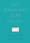 Front of card: Hand written text on teal background, with illustration of calendar that has a heart on a date. Text reads: One wonderful year together. Happy first anniversary.