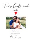 Front of card: To My Girlfriend Photo Upload Card Handwritten typography on a white background. Text reads: "To my Girlfriend Lois my partner my best friend my always". 'Lois' can be personalised!