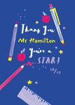 Front of card: Teacher's Thank You Card Handwritten typography surrounded by stationery on a blue background. Text reads: "Thank you Mr Hamilton you're a star! 10/10". 'Mr Hamilton' can be personalised!