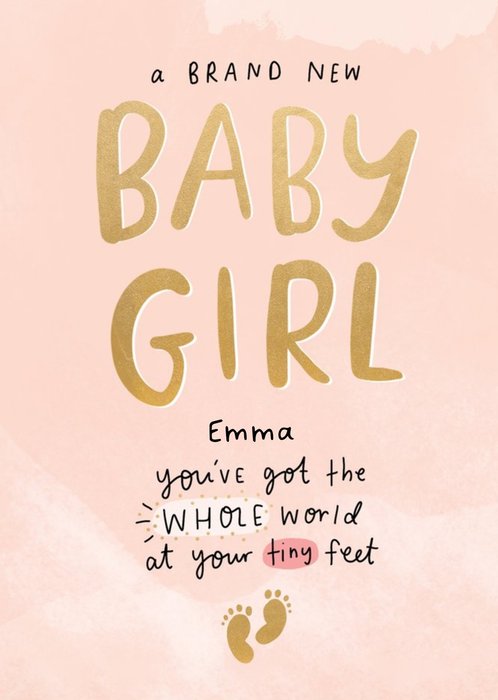 Front of card: New Baby Girl Card Handwritten typography with baby footprints on a pink background. Text reads: "A brand new baby girl Emma you've got the whole world at your tiny feet". 'Emma' can be personalised!