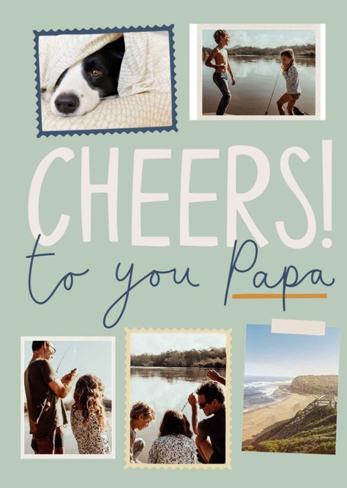 Front of card: 'To you Papa' Photo Upload Birthday Card Handwritten typography with 5 photo frames on a light teal background. Text reads: "Cheers! to you Papa".