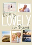 Front of card: 'To my lovely Husband' Photo Upload Birthday Card Handwritten typography with 5 photo frames on a cream background. Text reads: "To my lovely husband".