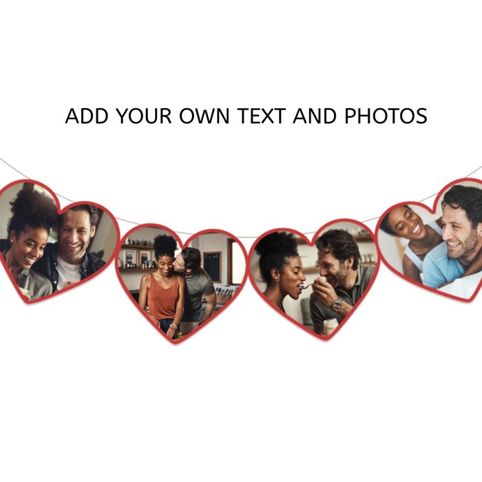 Front of card: A modern design featuring 4 hanging heart-shaped photo upload frames. This fully editable design allows you to add text and stickers to create a truly personalised card.