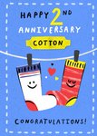 Featuring two smiling cartoon socks hanging from a washing line, with playful red and yellow hearts floating between them. The bright blue textured background and stitched border details frame cheerful hand-lettered text celebrating a 2nd wedding anniversary, traditionally known as the cotton anniversary. A fun, light-hearted design perfect for congratulating a happy couple.