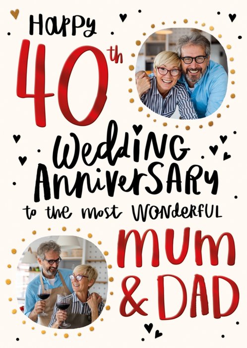 Front of card: Featuring 2 circular photo areas framed by dotted gold borders & hand-lettered black script and shimmering red typography, all on a white background scattered with black heart illustrations.br> Text reads: "Happy 40th wedding anniversary to the most wonderful mum & dad."