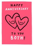 A fun, romantic design featuring an illustration of two overlapping hearts with smiley faces, and bold hand-lettering on a pink background with a white edge.