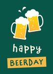 A dark green background featuring two illustrated beer mugs clinking together, with frothy foam and splash details above them. Beneath the image, playful white and yellow text.
