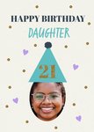 Front of card: This greeting card design features a cream background with scattered gold glitter dots and purple hearts as accents. The text “Happy Birthday Daughter” is displayed prominently in bold serif and playful script fonts at the top. Below, there is an oval-shaped photo upload area topped with a teal party hat that features a black pom-pom and glittery gold “21” text in the centre.