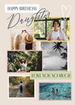 This greeting card design features a neutral beige background with a mix of serif and script fonts displaying the text “Happy Birthday Daughter” at the top and “Love You So Much” near the bottom. It includes six rectangular photo upload areas: one large yellow-bordered frame at the upper right, one pink-bordered frame at the centre left, one white-bordered frame at the bottom left, one pink-bordered frame at the bottom right, one green-bordered frame at the centre middle, and one black-and-white bordered frame at the centre right. Hand-drawn heart doodles add a playful touch to the elegant layout.