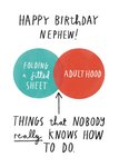 "Happy Birthday Nephew! Folding a fitted sheet. Adulthood. Things that nobody really knows how to do."