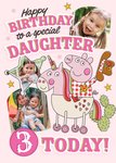A fun and lively greeting card featuring Peppa Pig dressed as a cowboy riding a unicorn, surrounded by sheriff stars, cacti, and three photo areas in playful shapes, all set against a light pink background.
