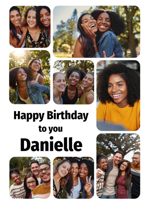 A modern, fully editable design featuring eight rounded photo frames in a collage layout with bold black typography on a white background