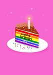The card shows a slice of rainbow-layered cake with chocolate icing and a candle.