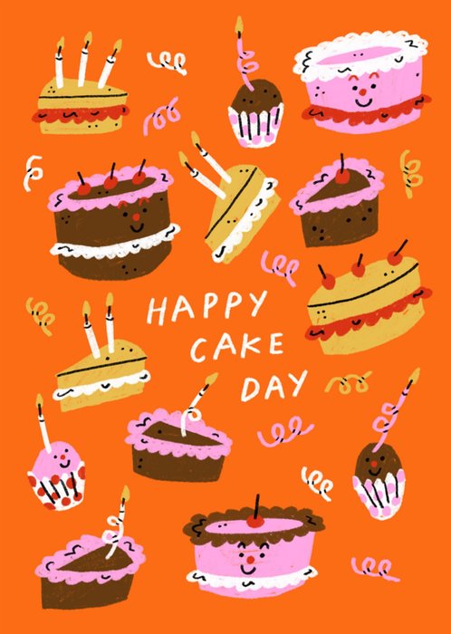 Front of card: Featuring playful illustrated smiling cakes, cupcakes, and candles on a bright orange background with white hand-lettered typography in the centre.