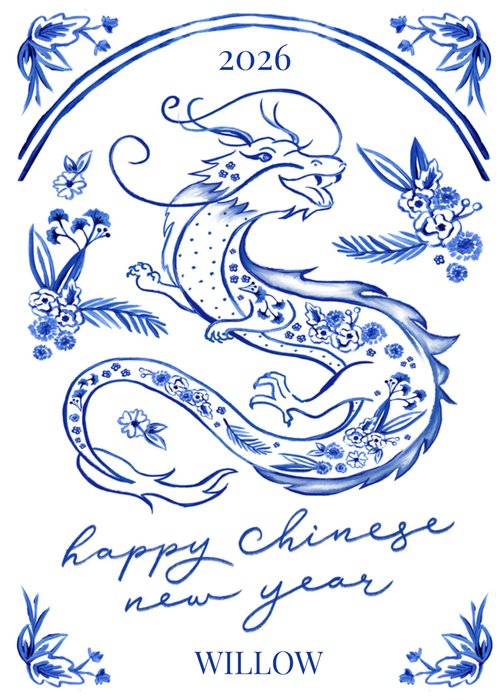 Front of card: Featuring an illustration of a Chinese dragon. Text reads: "2026 happy Chinese New Year Willow". '2026' and 'Willow' can be personalised!