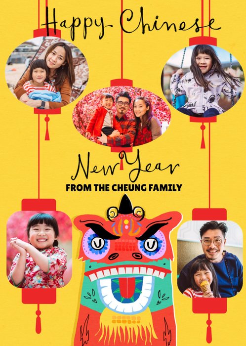 Front of card: Featuring an illustration of a Chinese dragon with five lantern photo frames. Text reads: "Happy Chinese New Year from the Cheung family". 'From the Cheung family' can be personalised!