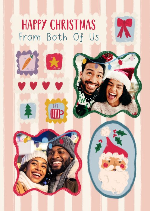 Featuring two photo frames with wavy edges and playful festive illustrations, including a bow, star, hearts, a Christmas tree, a mug & Santa motif on a pink and white striped coloured background.