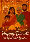 Warm illustrated family scene with grandparents, parents and child gathered around plates of traditional Indian sweets and glowing diyas under hanging lights and marigold garlands in rich orange and gold tones.