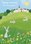 Front of card: Featuring an illustration of rabbits in a country meadow. Text reads: "Happy Easter Miss Boardman". 'Miss Boardman' can be personalised!