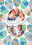 Front of card: Featuring two photo frames in the shape of an oval surrounded by illustrations of Easter eggs decorated with floral patterns. Text reads: "Happy Easter Grandma & Grandad". 'Grandma & Grandad' can be personalised!