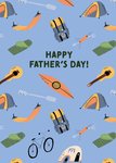 This vibrant Father’s Day greeting card features a playful outdoor adventure theme with illustrated camping gear, tents, kayaks, guitars, and tools scattered across a sky blue background for a fun, nature-loving dad.