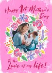 Front of card: Featuring a photo frame with an illustrated border of colourful flowers on a pink background. Text reads: "Happy 1st Mother's Day to the love of my life!".