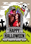 A modern design featuring an illustration of a gravestone with space for a photo upload and a blocky Halloween message. Behind the grave is a waving skeleton, additional gravestones and a spooky moon.