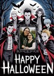 Front of card: A modern design featuring illustrated vampires surrounding a centralised photo upload frame with a Halloween message underneath. The design sits on a dark background with a glowing moon.