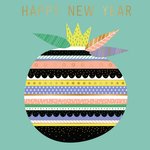 Front of card: A modern, vibrant design featuring colourful patterns layered to create a pomegranate illustration, with gold text above and a green background.