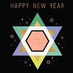 A modern design featuring a Star Of David decorated with colourful patterns, surrounded by smaller colourful stars. The design is contrasted against a black background.