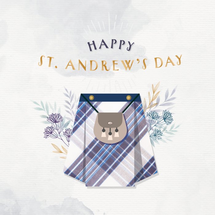 Front of card: A modern design featuring a blue tartan kilt with a sporran, framed by stylised thistles and soft foliage, on a white watercolour background.