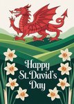 Featuring a red dragon above layered green hills with daffodils around central lettering, this greeting card has a cream upper background and dark green lower section.