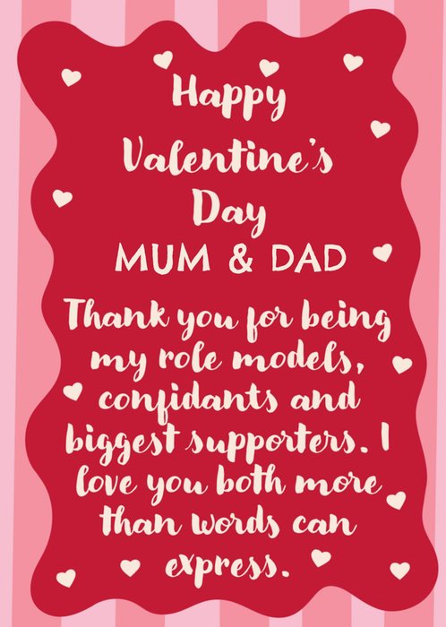 Front of card: Featuring a sentimental message surrounded by hearts. Text reads: "Happy Valentine’s Day Mum & Dad Thank you for being my role models, confidants and biggest supporters. I love you both more than words can express.". 'Mum & Dad' can be personalised!