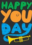 Front of card: Featuring bold colourful typography on a black background with a smiley face within the letter O and an illustration of a trumpet attached to the letter Y.