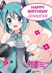 Front of card: Hatsune Miku Personalised Birthday Card Hatsune Miku smiking and posing for the camera and holding a music note in her hand, with text on the top of the card in a white bubble.Text reads: "Happy Birthday Jennifer". Jennifer is customisable