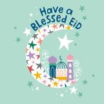 Front of card: A colourful design featuring a crescent moon filled with stars and a small mosque illustration on a mint green background scattered with stars.