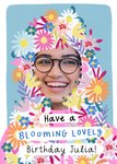 Front of card: Featuring an illustration of a girl with flowery hair alongside a photo frame for uploading your own face. Text reads: "Have a blooming lovely birthday!".