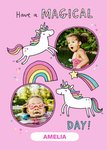 Front of card features 2 unicorn illustrations and 2 photo upload areas.