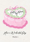 Front of card: Featuring an illustration of pink heart shaped cake. Text reads: "Happy birthday have a wonderful day Phoebe x". 'Phoebe x' can be personalised!