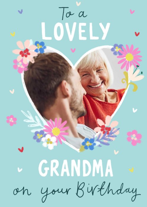Front of card: Lovely Grandma Photo Upload Birthday Card Heart photo frame surrounded by colourful flowers. Text reads: "To a lovely grandma on your birthday".