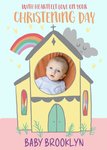 Front of card: Featuring an illustration of a church with a photo frame for a window. Text reads: "With heartfelt love on your christening day baby Brooklyn". 'Baby Brooklyn' can be personalised!