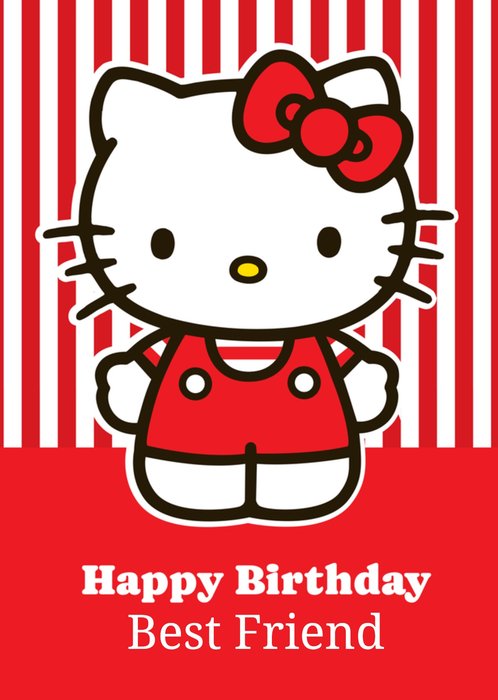 A vibrant Hello Kitty birthday card featuring the beloved character in a red outfit with a matching bow against a bold red and white striped background. Designed especially for a best friend, this cute and cheerful card is perfect for Hello Kitty fans.