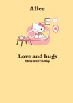 A sweet and warm Hello Kitty birthday card featuring the beloved character relaxing on a cosy pink chair with a book and a tea set beside her. With a soft pastel yellow background and a personalised name, this card is perfect for sending love and hugs on a special birthday.