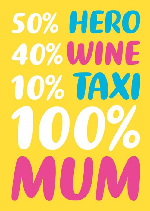 Text reads: "50% Hero, 40% wine, 10% taxi, 100% Mum".
