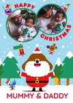 Features illustration of Hey Duggee dressed as Father Christmas, surrounded by other characters from the show in the snow, with two photo upload frames at the top of the design.