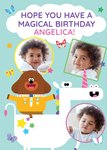 Front of card: Featuring an illustration of Duggee riding a unicorn with three photo frames. Text reads: "Hope you have a magical birthday Angelica!". All text can be personalised!