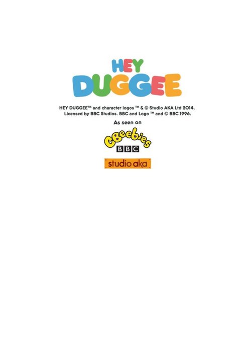 Front of card: Hey Duggee Photo Upload Valentine's Day Card Illustration of Hey Duggee and friends with a heart shaped photo frame. Text reads: "Happy Valentine's Day love from the kids." 'Love from the kids' can be personalised!.