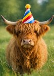 A fun, photographic design featuring a fluffy highland cow standing in a grassy field wearing a rainbow striped party hat.