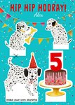 Front of card: Featuring illustrations of dalmatians and a birthday cake which could be cut out to make a diorama. Text reads: "Hip hip hooray Alex 5". 'Alex' and '5' can be personalised!