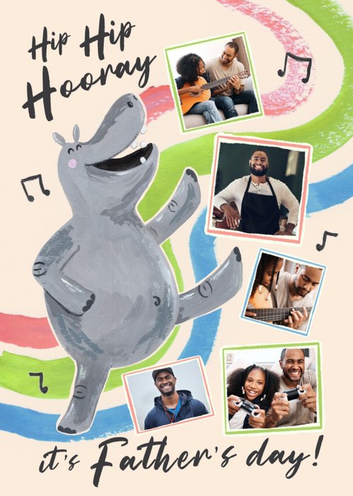 Front of card: Featuring a fun illustration of a happy hippo dancing to music with musical notes and colourful wavy lines in the background. There are five photo upload areas in hand-drawn frames.